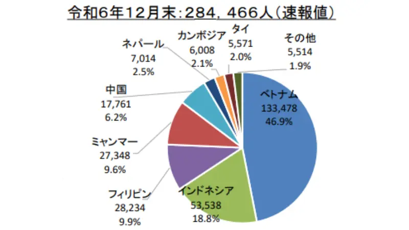 2024年12月末時点での特定技能在留外国人数は、284,466人に達し、前年同期比で約36,000人の増加となりました。国別では、ベトナムが133,478人で全体の約47%を占め、引き続き最多となっています。次いで、インドネシアが53,538人、フィリピンが28,234人、ミャンマーが27,348人、中国が17,761人と続いています。