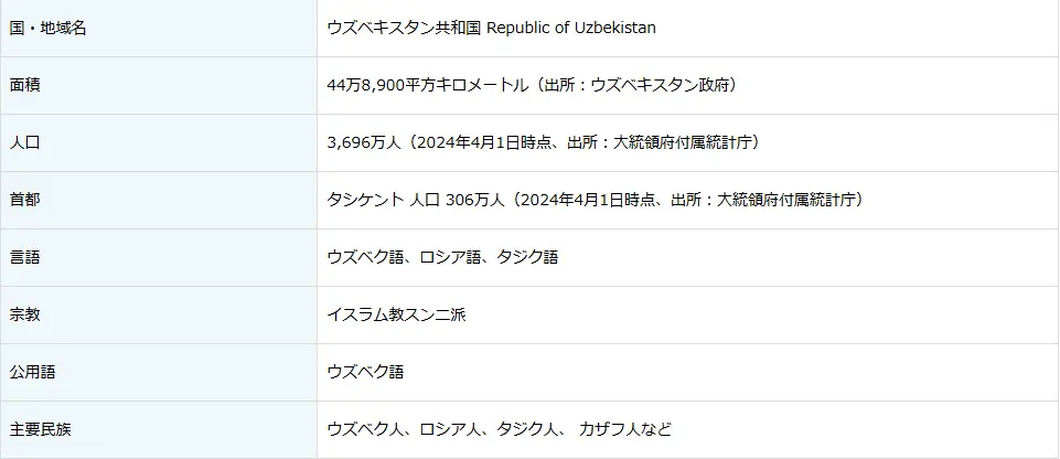 ウズベキスタン共和国は、中央アジアに位置する内陸国で、東はキルギスとタジキスタン、南はアフガニスタン、西はトルクメニスタン、北はカザフスタンと国境を接しています。首都はタシュケントで、政治・経済・文化の中心地となっています。