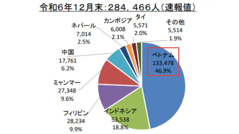 日本における特定技能1号人材の在留者数は、2024年末時点で約28万4,000人、そのうちベトナム国籍者は約13万3,000人と全体の約47%を占めています。この数字からも、ベトナムは日本にとって最大の人材供給国であり、今後の採用戦略において欠かせない存在です。