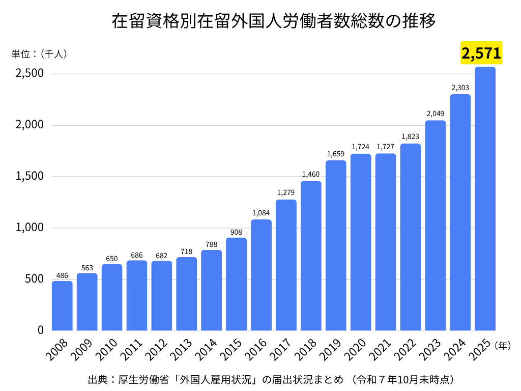 厚生労働省の発表によると、外国人労働者数は2,571,037人となり、前年から約26万人増加しました。これは届出義務化以降、過去最多の水準です。