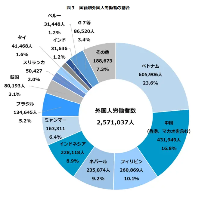 ベトナムは引き続き最多であり、技能実習・特定技能制度を通じた来日が増加しています。