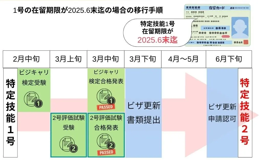 次に、試験受験から特定技能2号移行までのスケジュールをご紹介します。2つの試験を一回で合格できた場合の最短の移行ルートが下記の通りです。
