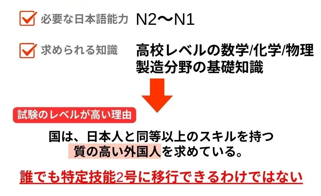 筆記試験の問題はかなり難易度が高く、一定のレベルを有していないと合格は難しいと考えられます。そのため、特定技能2号への移行を目指す現在の1号の人材に対しては、早期に試験対策を始めるよう企業側から促すことが重要です。