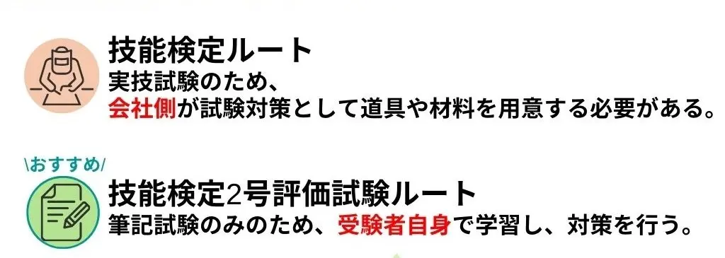 まず、特定技能2号の資格を取得するためのルートは2つあります。1つ目は実技試験を受ける「技能検定ルート」、2つ目は2つの筆記試験を合格する「技能検定2号評価試験ルート」です。いずれも、日本での3年以上の実務経験が必要です。